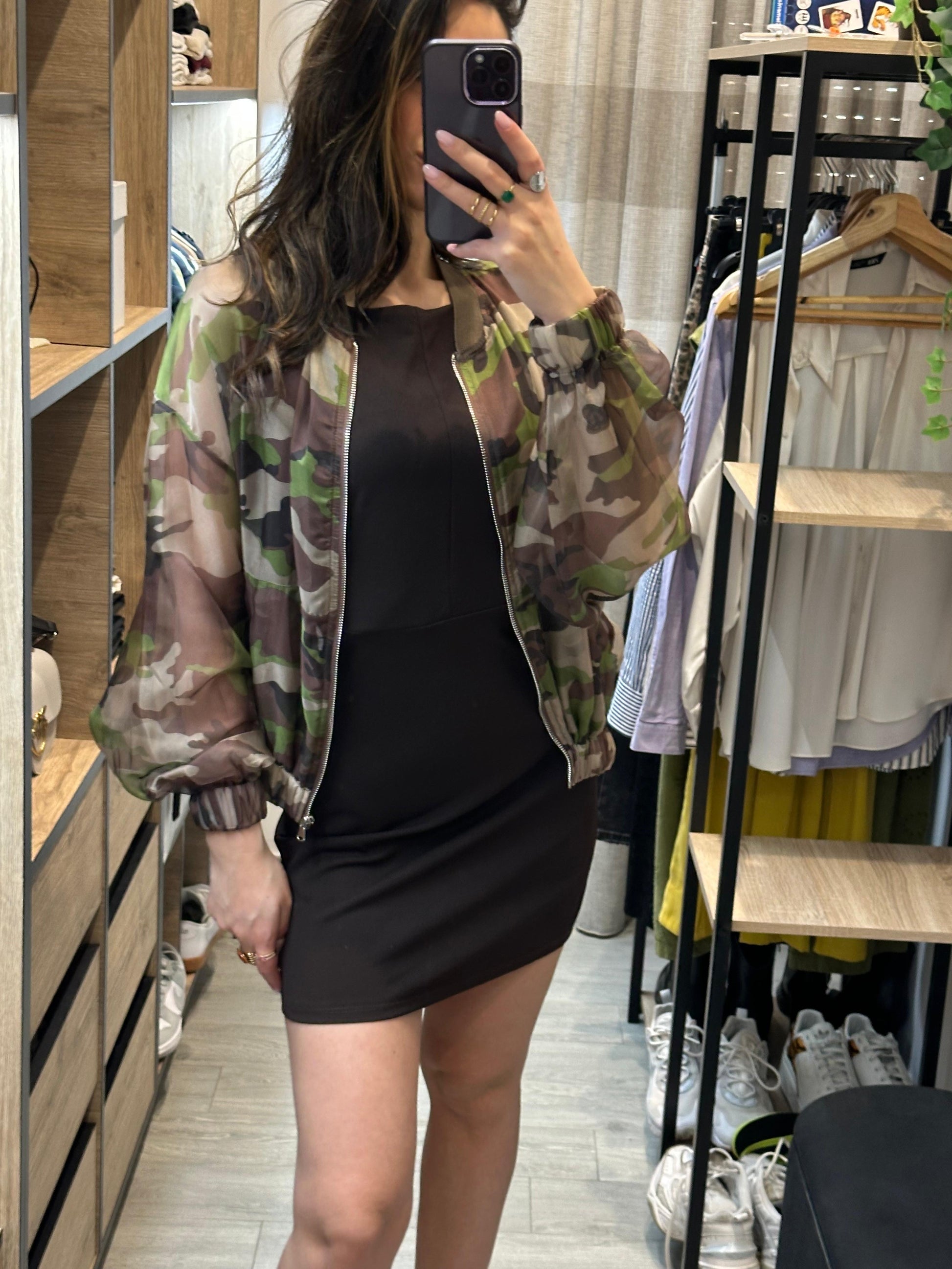 °Descrizione: Giacchino camouflage velato ,collo rotondo elasticizzato, maniche lunghe e spalle cadenti, chiusura frontale con cerniera e orli elasticizzati