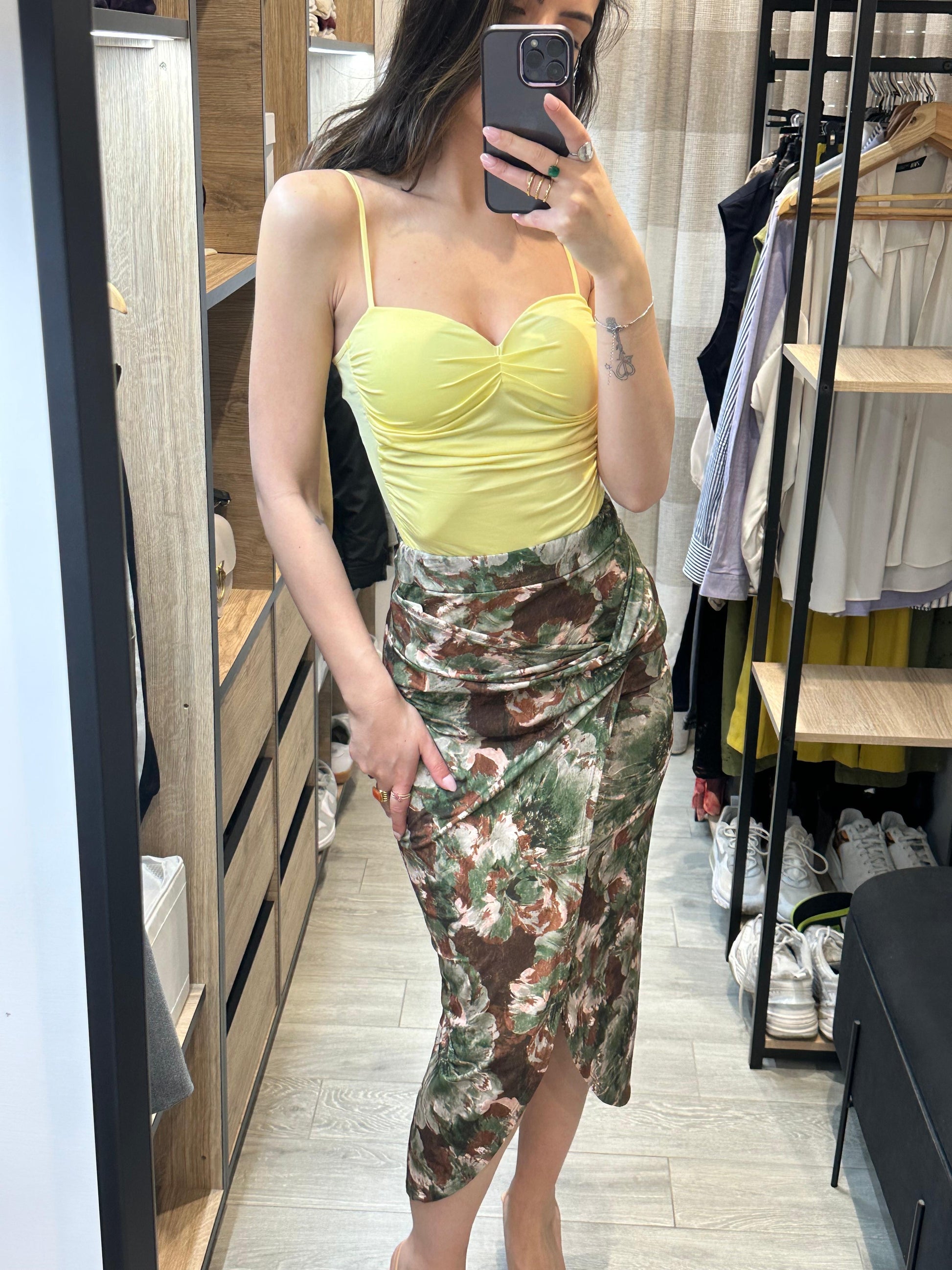 °Descrizione: Gonna longuette con elastico in vita, effetto portafoglio